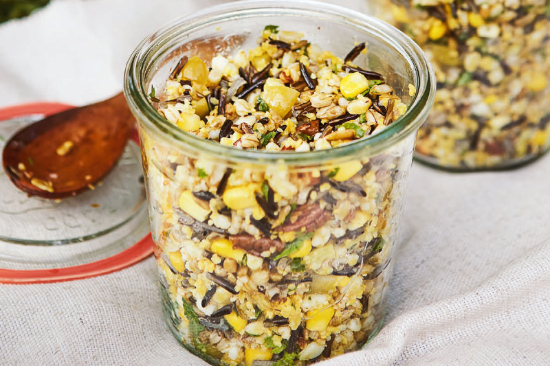 Em uma assadeira, coloque as nozes e leve ao forno preaquecido por cerca de 10 minutos. Retire e reserve. Em uma vasilha grande, coloque a cevada, o trigo com o arroz selvagem, a canjiquinha, o milho, as azeitonas, as nozes, as sementes de girassol, o cominho e a salsinha. Tempere com azeite de oliva e sal e misture delicadamente. Sirva a salada em temperatura ambiente ou gelada.